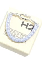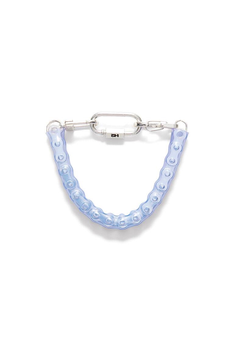 Посеребренное браслет-цепочка в виде велосипедной цепи с пластиковым покрытием. Крючки с карабинами и кольцо для карабина. Длина 8 1/4 дюйма.
