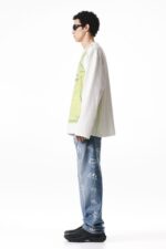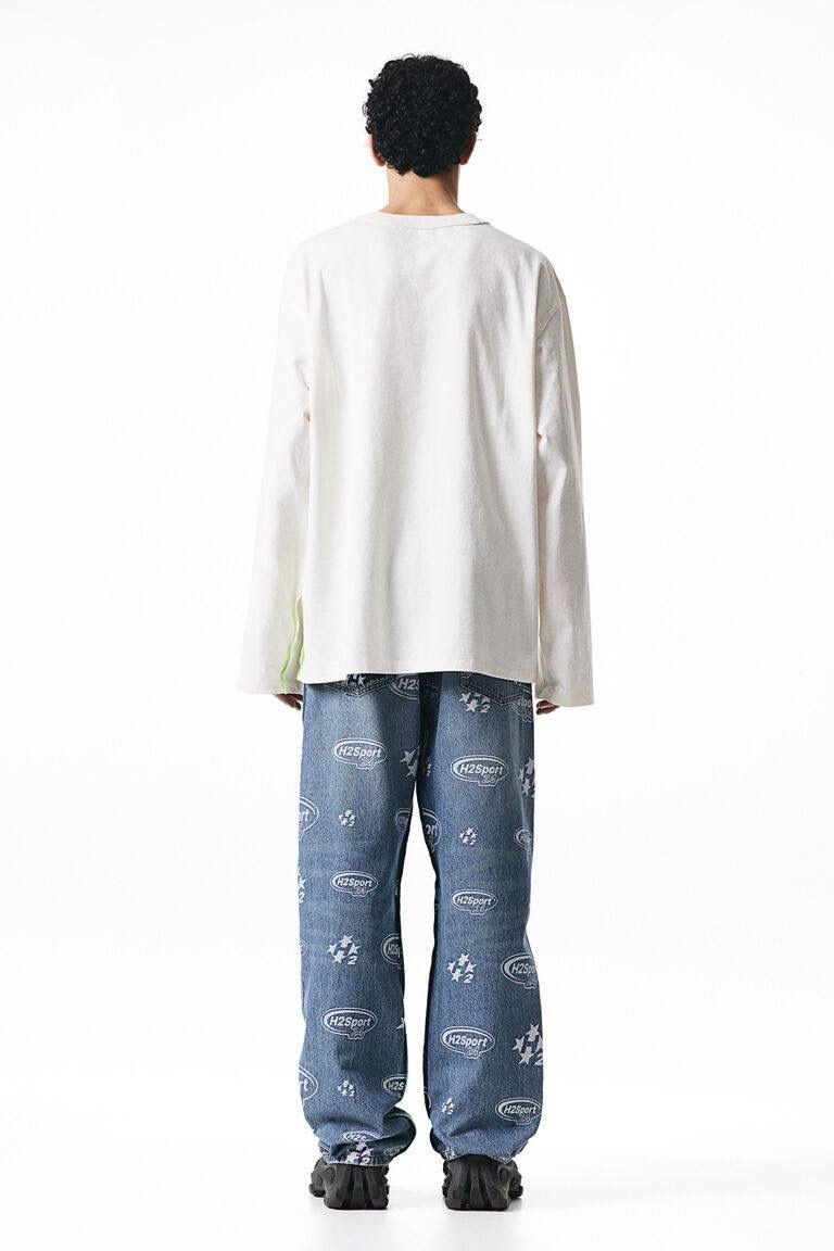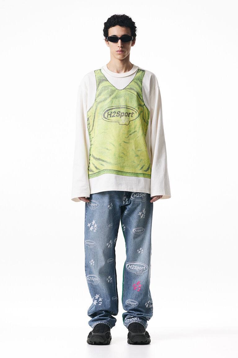 Топ из плотного хлопкового трикотажа с принтом спереди. Круглая горловина с ребристой отделкой. Длинные рукава. Опущенные плечи. Один боковой шов цветной. Прямой подол. Просторный и очень свободный крой оверсайз.