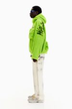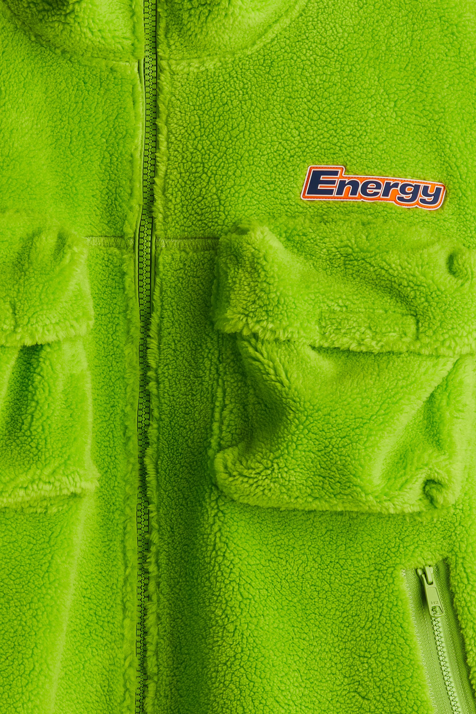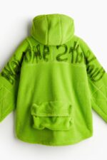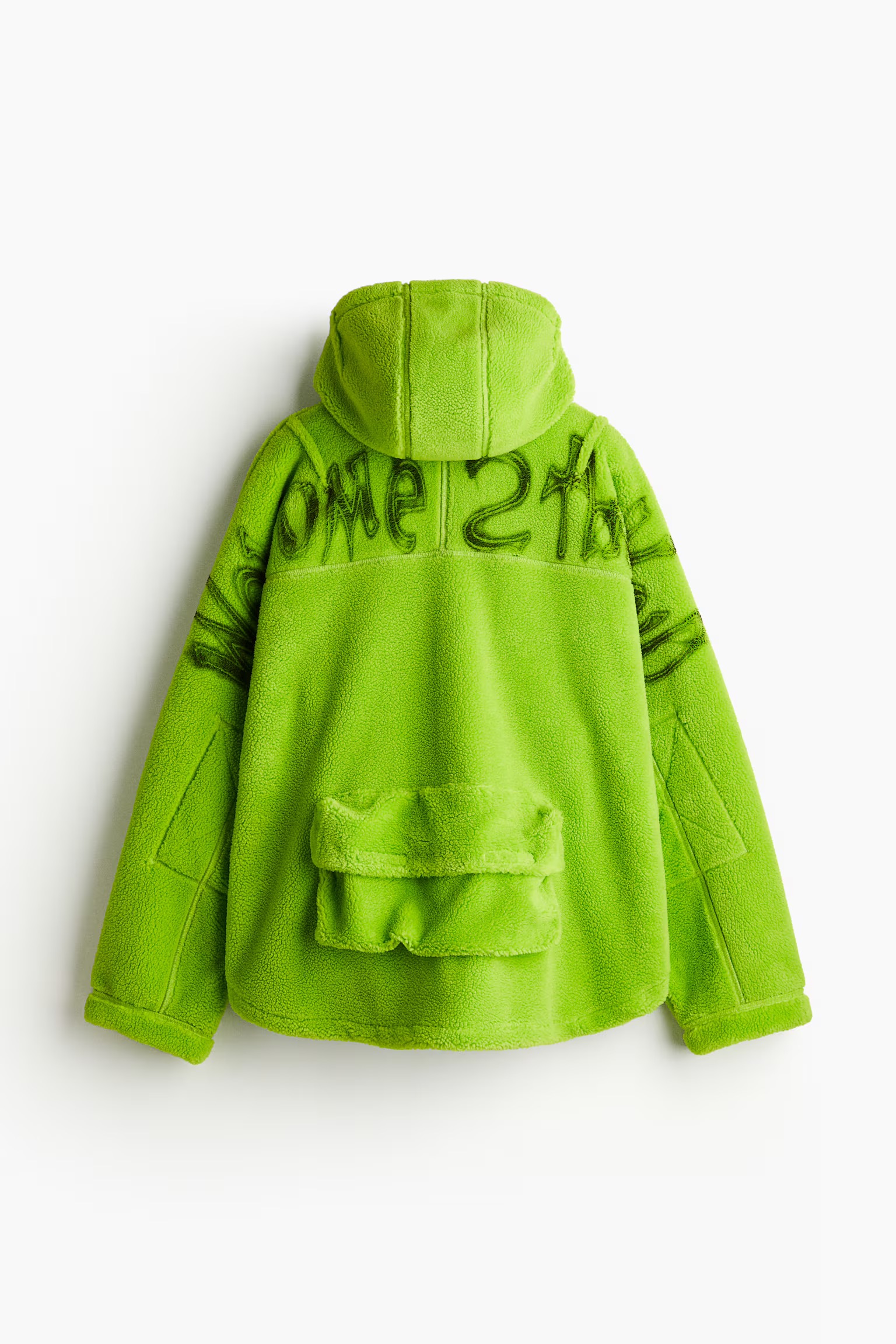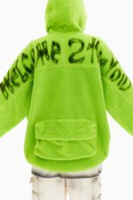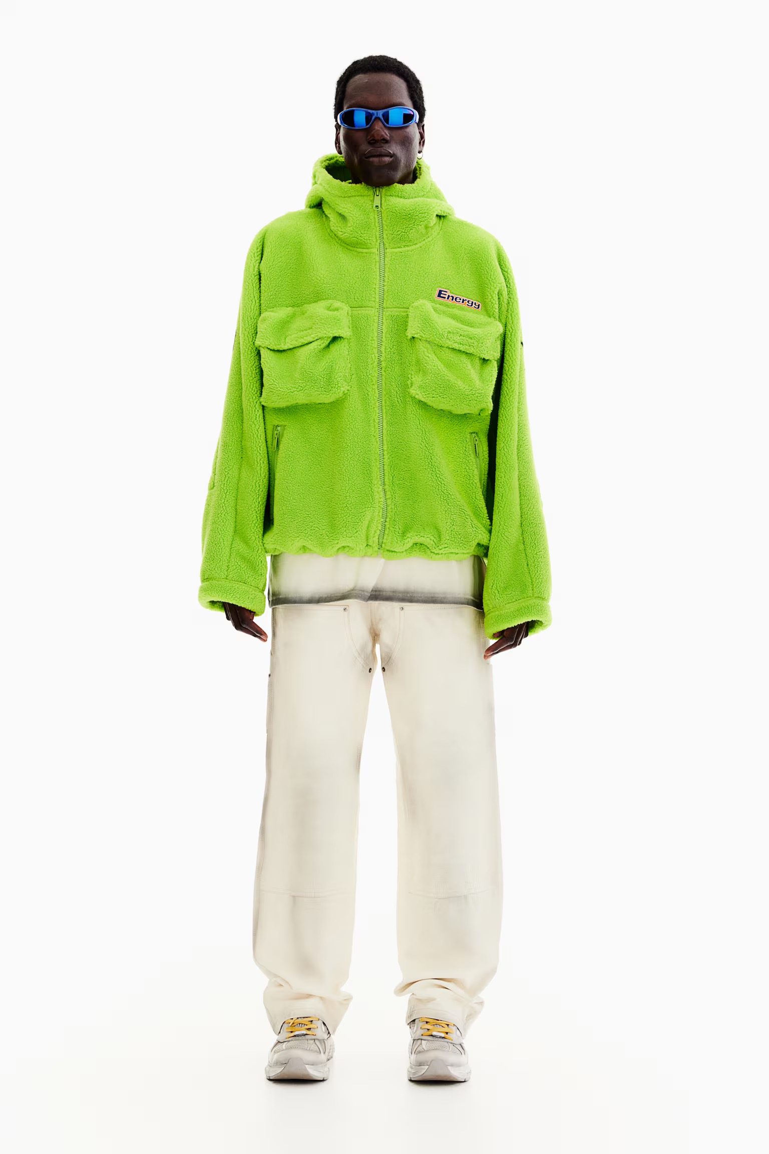 Куртка из мягкого флиса Тедди с капюшоном на эластичной кулиске, застежкой-молнией спереди, карманами-книжками с клапаном и застежкой на липучке на груди, косыми карманами на молнии спереди и большим карманом-книжкой с клапаном и застежкой на липучке сзади. Заплатки на локтях и эластичный шнурок по подолу. Силиконовая нашивка на груди и крупный текстовый принт на спине. Без подкладки.