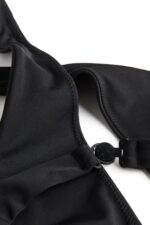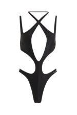 Купальник-стринги с вырезом по центру груди и бретельками-халтер, которые перекрещиваются спереди и завязываются сзади на шее. Узкие регулируемые бретели, вырезы на талии, подчеркивающие изгибы, и частично открытая спина с металлической застежкой с выгравированным логотипом дизайнера. Высокая посадка.