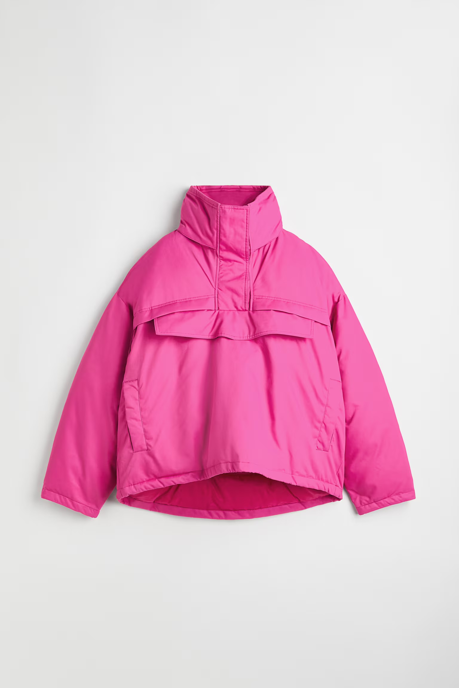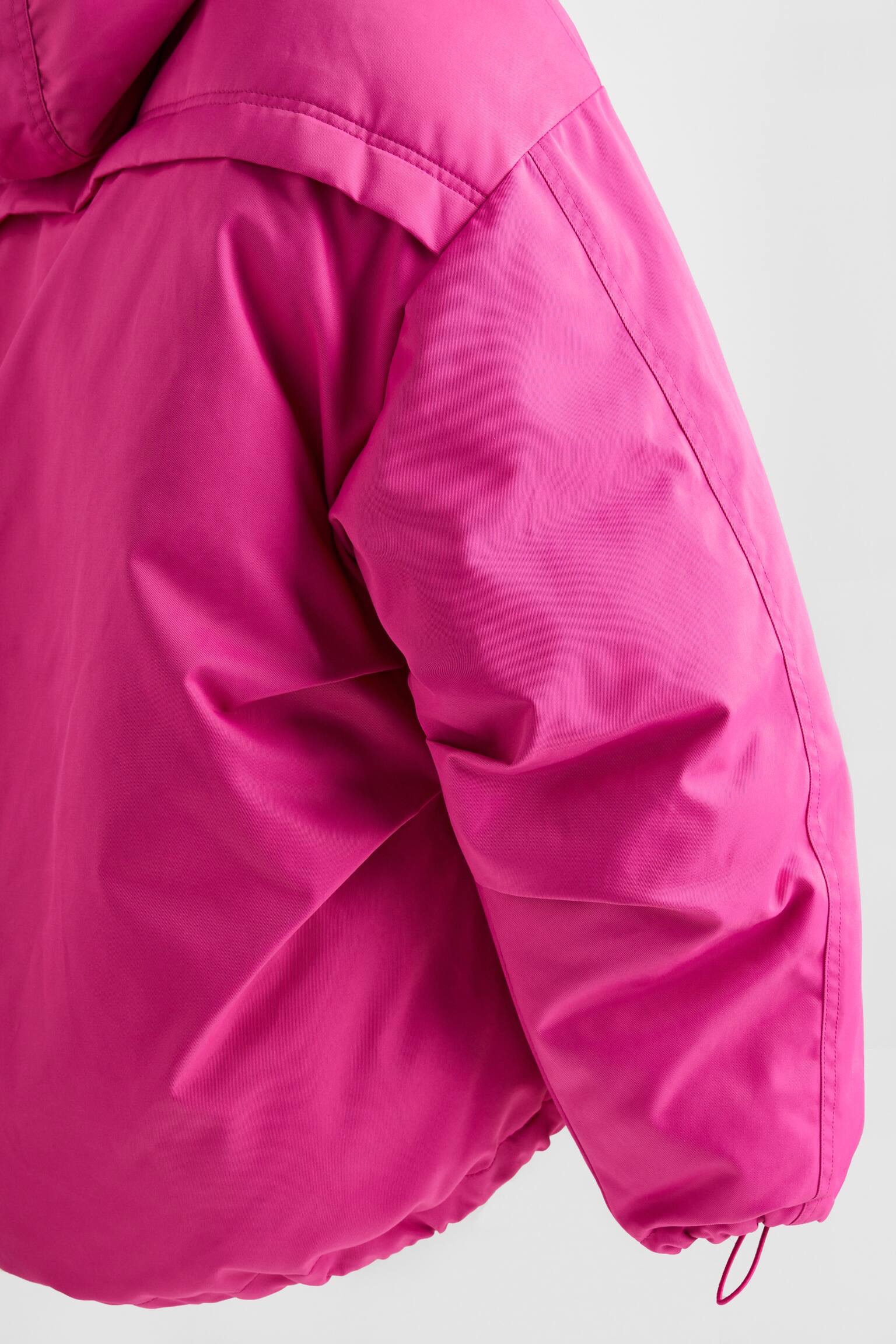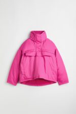 Утепленная куртка-поповер из твила свободного кроя. Воротник-стойка с внутренней вставкой и ветрозащитной планкой на потайных кнопках. Свободный фасон со спущенными плечами, длинными рукавами, широким нагрудным карманом с клапаном на потайной молнии и прорезными боковыми карманами на потайной кнопке. Эластичная кулиска со шнурками-фиксаторами на манжетах и подоле. Удлиненная сзади со складками по бокам для создания пышного, округлого силуэта. На подкладке.