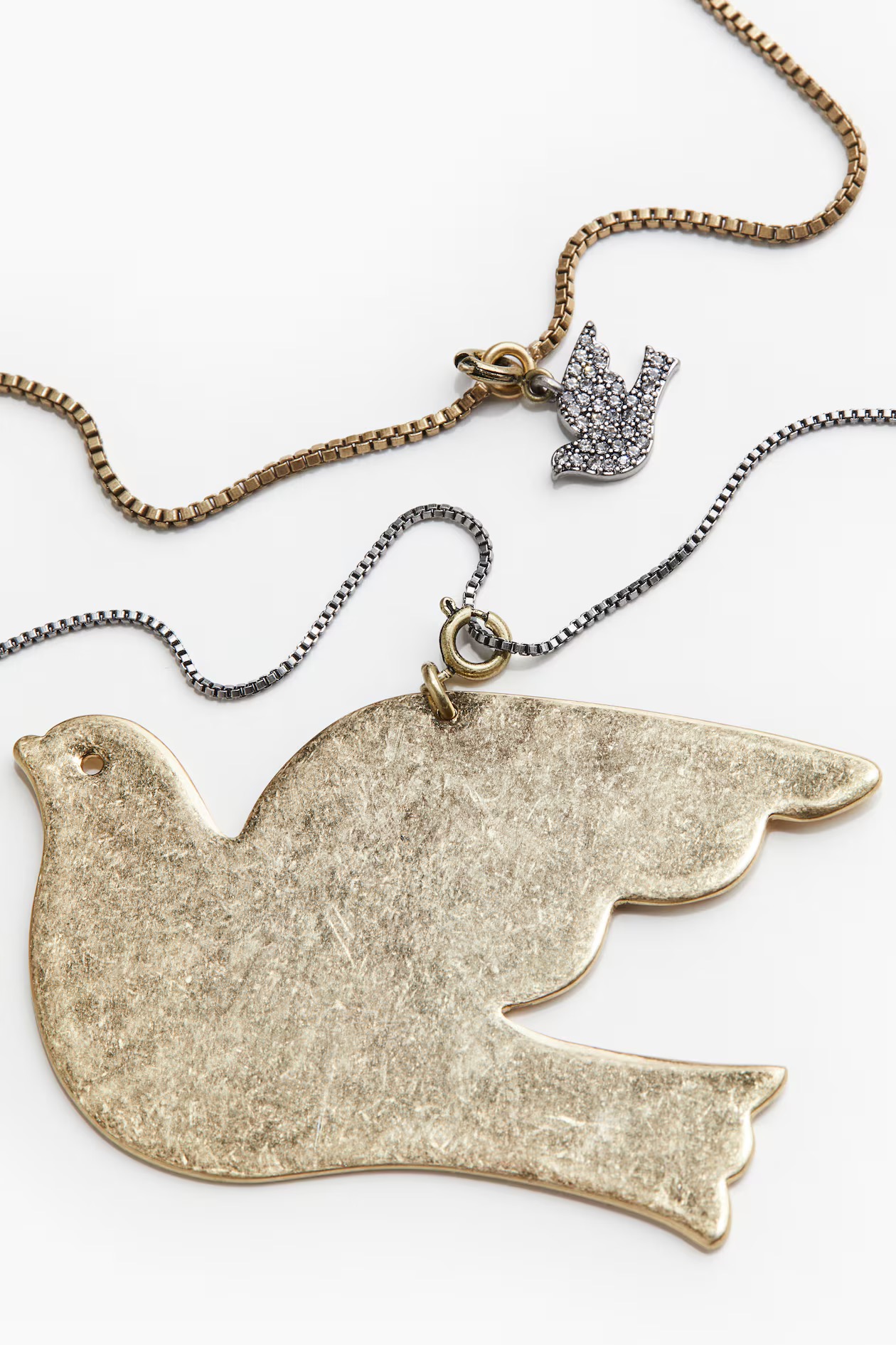 Короткое колье состоит из двух металлических цепочек разных дизайнов. Обе цепи украшены очаровательными металлическими голубями: большой голубь с потертой поверхностью, а маленький со стразами. Т-образная застежка.