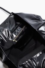 Очень большая сумка-шоппер из блестящей ткани с текстурированной поверхностью. Cумки создает стильную трапециевидную форму. Одно открытое отделение и одно отделение на молнии. Подкладка из хлопчатобумажной ткани. Толщина 20 см. Ширина в самой узкой части 50 см. Высота 52 см. Ширина в самом широком месте 73 см.