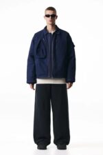 Легкая утепленная куртка из прочной хлопковой парусины с принтом в виде текста на спине. Воротник, молния спереди, заниженная линия плеча, длинные рукава с заплатками на локтях и внутренняя резинка на манжетах. Большой накладной карман на молнии с одной стороны груди и отделением для карточек с другой стороны. Диагональные прорезные боковые карманы на молнии и карман на рукаве с клапаном на липучке. Прямой край спереди и немного удлиненный закругленный край сзади. Модель оверсайз для мешковатого, очень свободного силуэта. Стеганая подкладка с мерцающим металлическим отливом.
