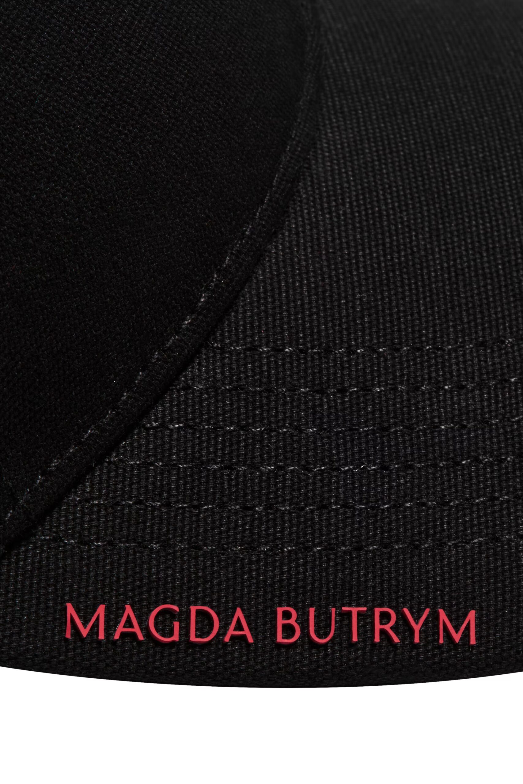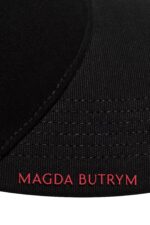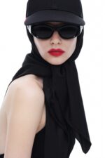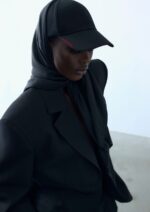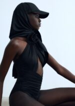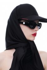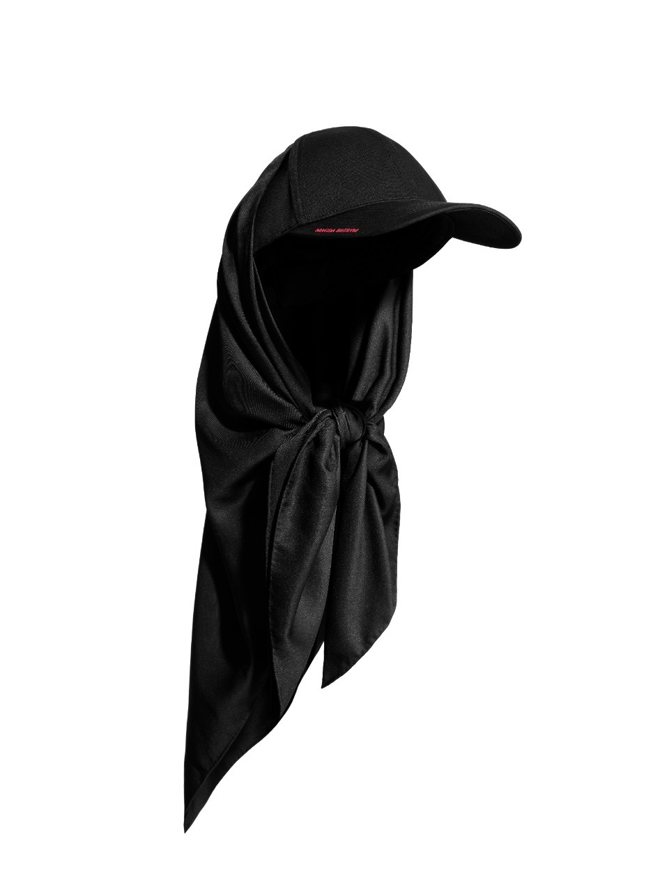 Кепка на подкладке из хлопка с интегрированным шарфом с завернутым краем из мягко драпированной тканой ткани, пришитой сверху. Кепка с напечатанным резиновым мотивом на полях с логотипом дизайнера и регулируемым хлястиком сзади с металлической застежкой. Шарф обеспечивает защиту от солнца и служит универсальным декоративным элементом с различными вариантами укладки.