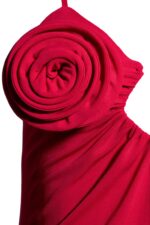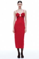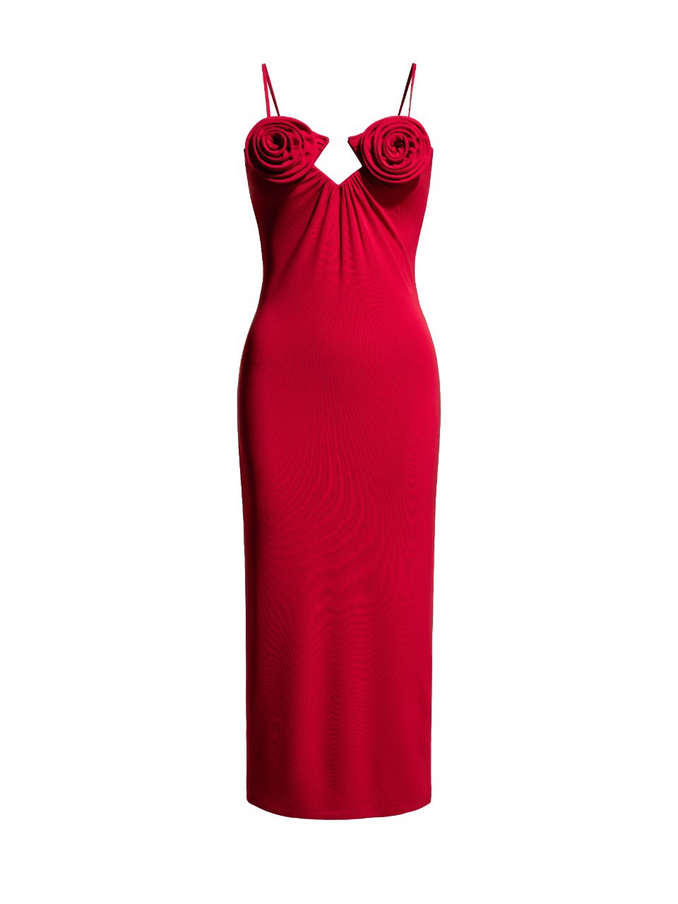 Платье длиной до икр из мягкого вискозного трикотажа. Чашечки с фирменной аппликацией в виде розы дизайнера. Обе аппликации двухслойные с проволокой по краям для сохранения структуры и объема. Ромбовидный вырез в центре груди, поддерживаемый закрытой металлической проволокой со сборками для эффекта рюшей. Регулируемые, очень узкие бретели. Лиф со скрытой силиконовой лентой и косточками по бокам для фиксации платья на месте при ношении без бретелек. Скрытая молния сзади с застежкой на крючки и петли. Прямой подол с высоким разрезом сзади. На подкладке.