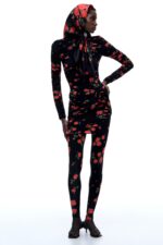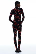 Короткое облегающее платье из эластичного крепового трикотажа, покрытое нежными сборками для мягкого драпирующегося эффекта. Перекрывающиеся панели спереди юбки соединены фирменной аппликацией в виде розы дизайнера. Аппликация двухслойная с проволокой по краям для сохранения структуры и объема. Ложный воротник-водолазка, длинные рукава и потайная застежка на крючки сзади с застежкой-молнией и бегунком в форме розы. Короткая юбка-подкладка из трикотажа.