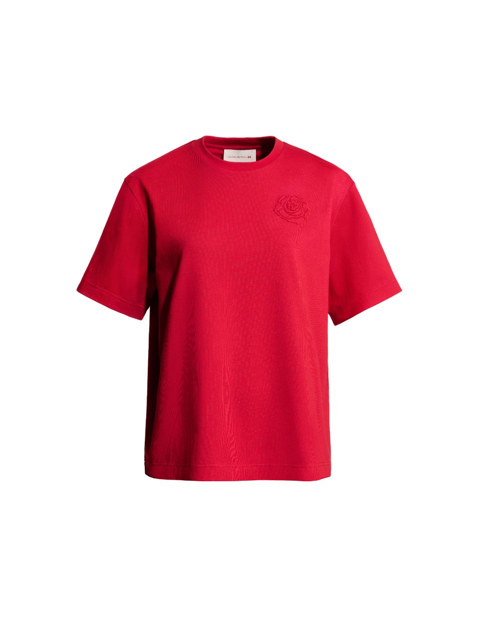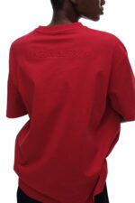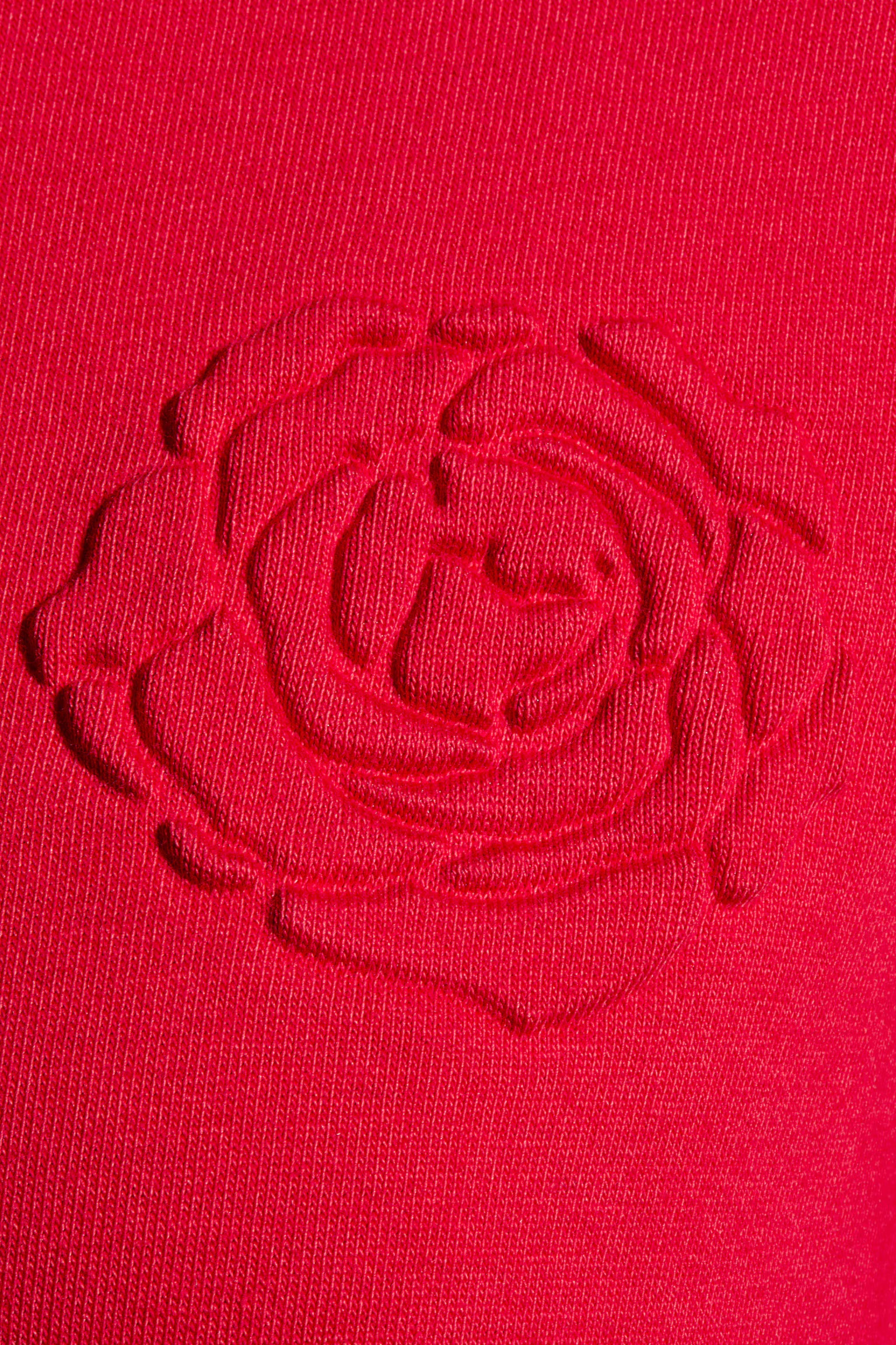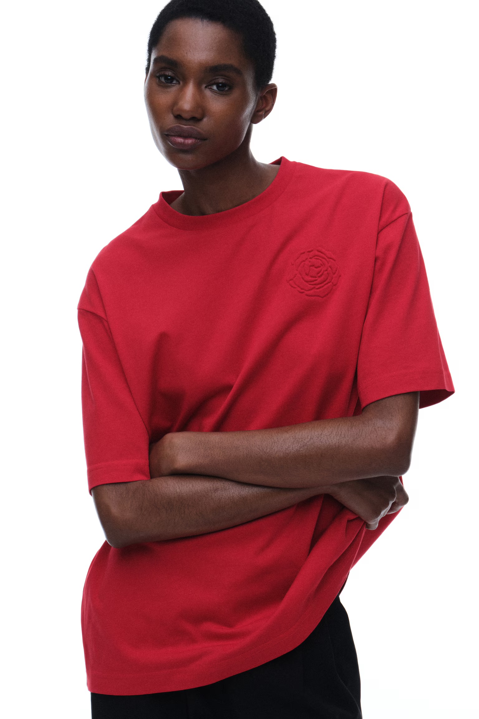 Футболка oversize из мягкого хлопкового трикотажа с тисненым рисунком спереди и сзади. Рисунок спереди представляет собой фирменный мотив розы дизайнера, а рисунок сзади — логотип дизайнера. Ребристый вырез, спущенные плечи и прямой подол.
