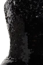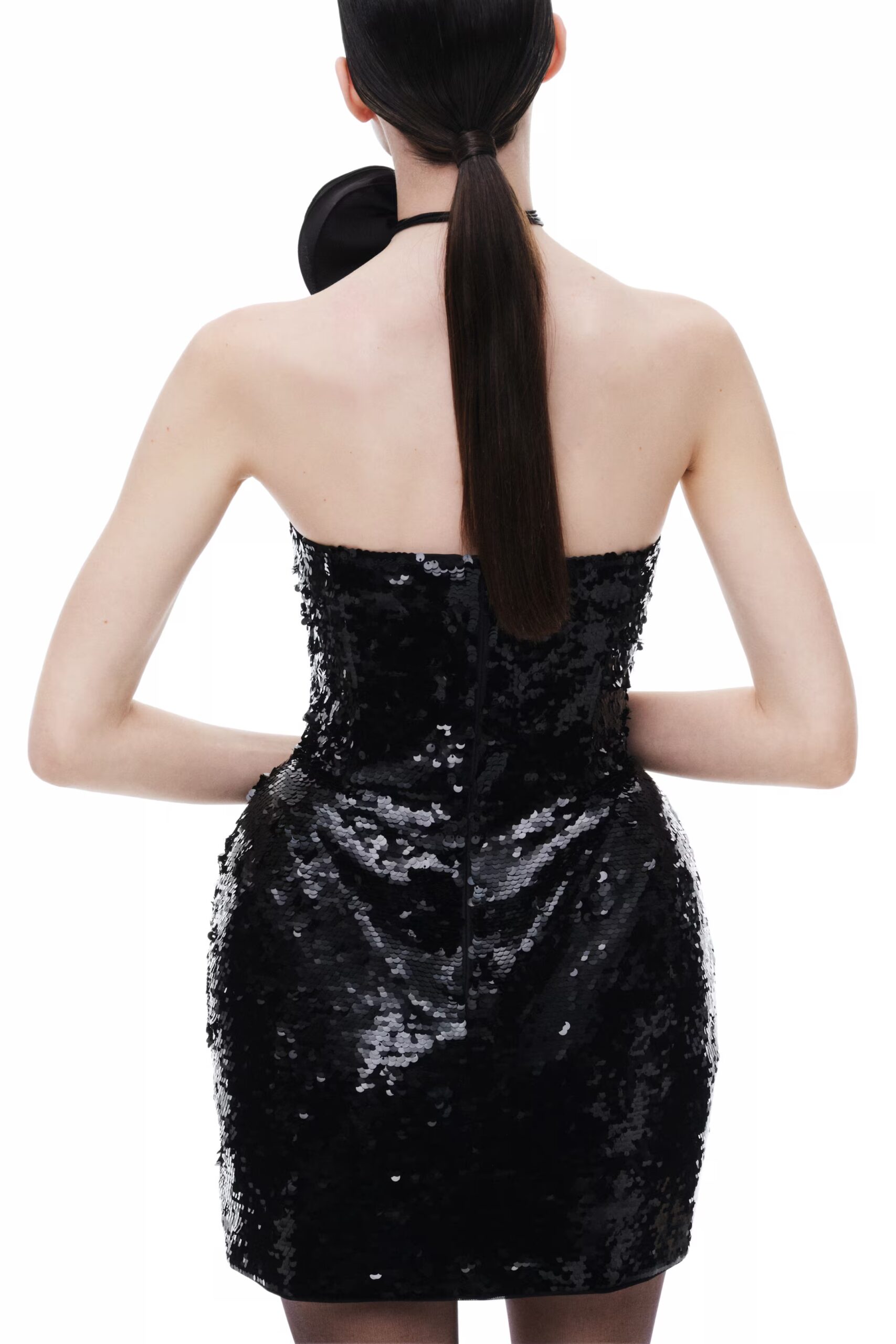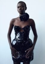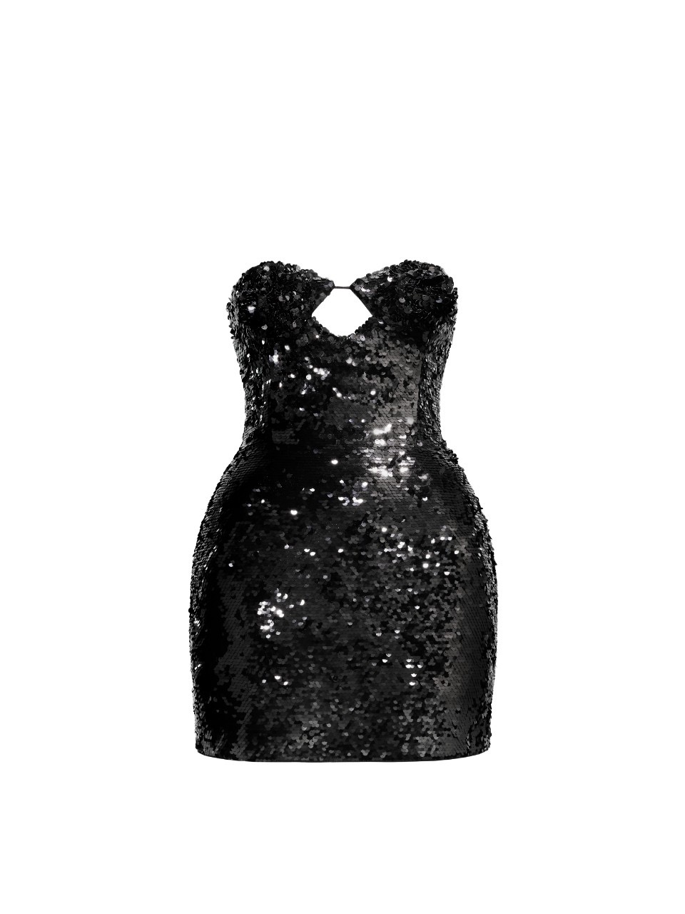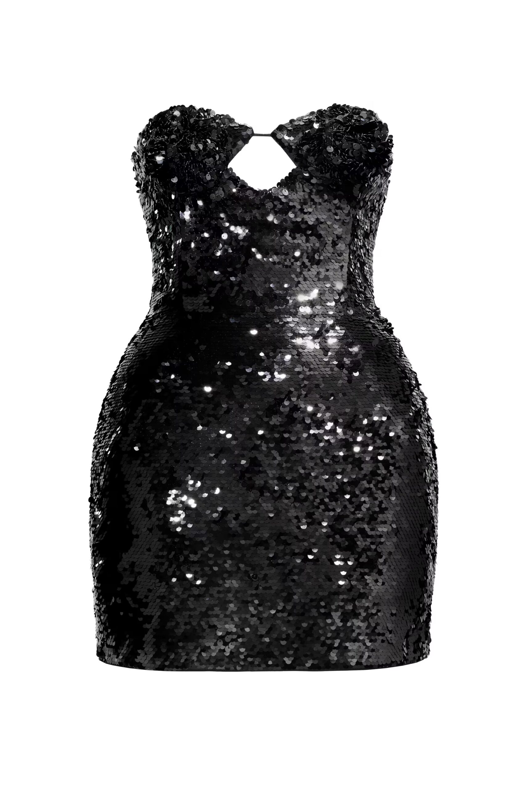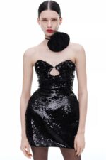 Приталенное мини-платье без бретелек из пайеточной сетки с лифом в стиле корсета, подушечками на бедрах и формирующими швами спереди и сзади для создания силуэта «песочные часы». Вырез сердечком с ромбовидным вырезом по центру груди, поддерживаемым скрытой металлической проволокой, чашки с фирменной аппликацией в виде розы дизайнера и потайная молния сзади с застежкой на крючки. Корсет из сетчатой подкладки с силиконовой лентой внутри верхнего края, косточками для поддержки и застежкой на крючки сзади. Подкладка из атласа.